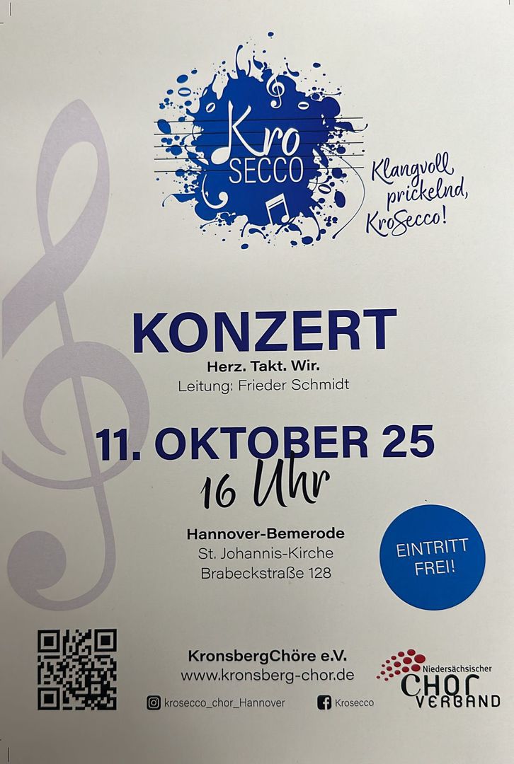 Samstag, 19.10 2019, 18:00, KroSecco 20 Jahre Jubiläumskonzert "Our Songs"Johanniskirche Bemerode, Brabeckstrasse